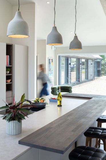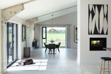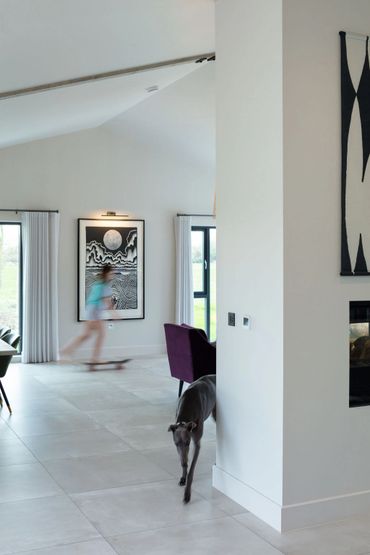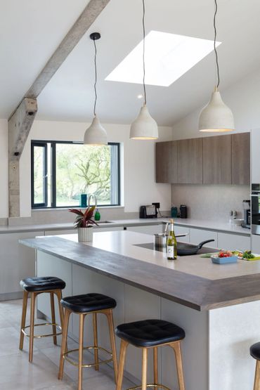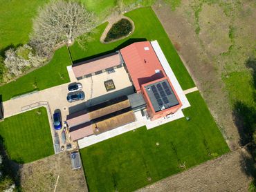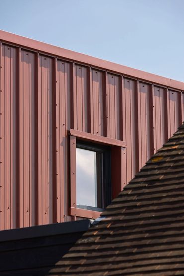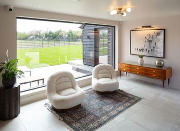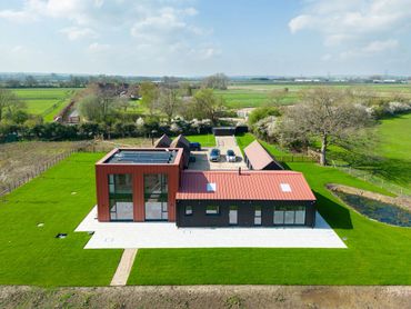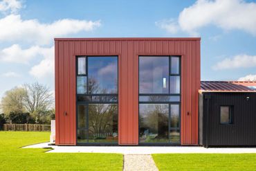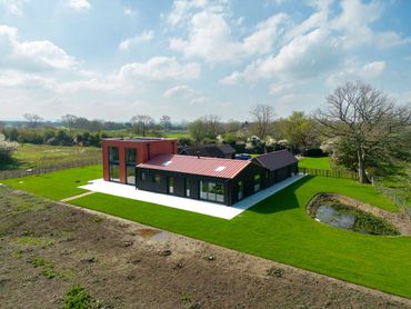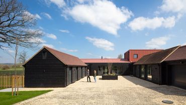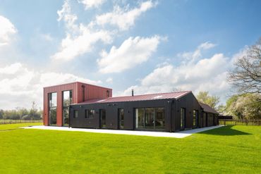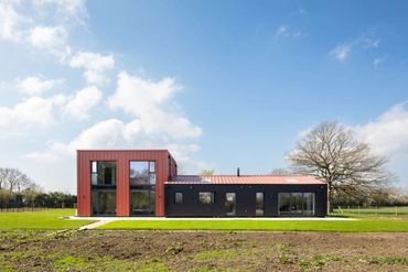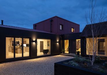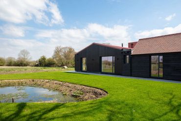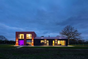 The project re-purposes an old cattle shed, horse stable and hay bale barn to create a super sustainable, open-plan and high tech home in the countryside. The existing structure has been retained, solar panels, air-source heat pumps and electrical battery storage help power the home. Continuous passive ventilation, deep reveals for solar shading and a balancing pond help future-proof against the effects of climate change. UK sourced timber and pre-fabricated insulated metal panels create a striking yet familiar appearance in the rural setting.